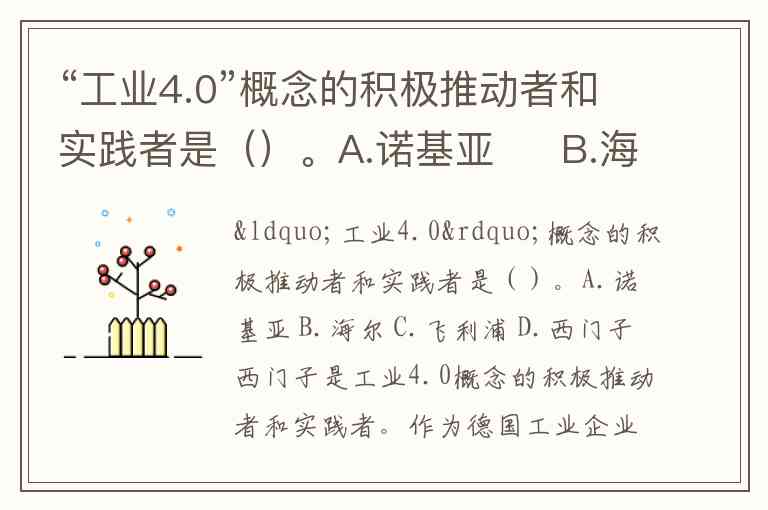 相比之下,其他选项中:海尔作为中国企业虽在智能工厂建设上有实践(如沈阳冰箱工厂生产效率提升30%),但更多是工业4.0的应用者而非概念发起者;诺基亚和飞利浦的核心业务聚焦于通信与消费电子,并未在工业4.0的技术体系构建中扮演关键角色。西门子的独特性在于,它既是标准制定者(如参与德国工业4.0平台),又是解决方案提供商,其全整合自动化(TIA)和全整合能源管理(TIP)系统已成为行业标杆。