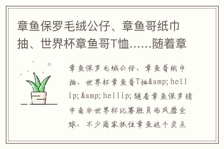 章鱼保罗因预测世界杯比赛走红后,商家迅速推出章鱼保罗毛绒公仔、章鱼哥纸巾抽、世界杯章鱼哥T恤等商品,这体现了消费引导生产发展的经济规律。当消费者对章鱼形象产生追捧时,市场需求信号促使商家调整生产方向,开发相关衍生品以满足这一新兴需求。