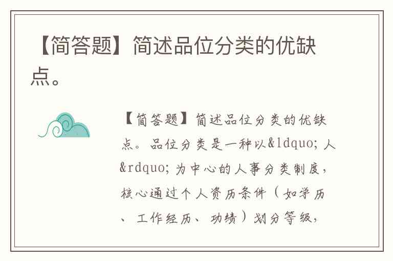 品位分类是一种以“人”为中心的人事分类制度,核心通过个人资历条件(如学历、工作经历、功绩)划分等级,而非职位本身特性,常见于等级观念浓厚的国家。其优缺点如下: