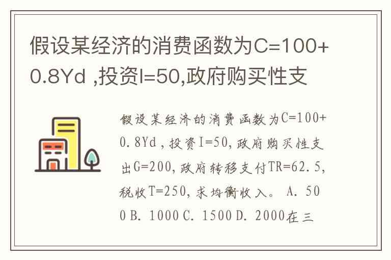 假设某经济的消费函数为C=100+0.8Yd ,投资I=50,政府购买性支出G=200,政府转移支付TR=62.5,税收T=250,求均衡收入。 A. 500 B. 1000 C. 1500 D. 2000
