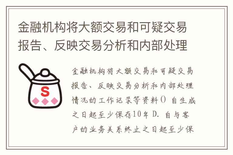 金融机构将大额交易和可疑交易报告、反映交易分析和内部处理情况的工作记录等资料() 自生成之日起至少保存10年 D. 自与客户的业务关系终止之日起至少保存10年A.自生成之日起至少保存5年 B.自与客户的业务关系终止之日起至少保存5年 C.
