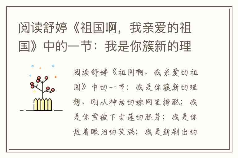 舒婷的这节诗以饱含激情的意象群,展现了改革开放初期祖国挣脱枷锁、走向新生的蓬勃气象。诗人将自我与祖国融为一体,通过“理想”“胚芽”“笑涡”“起跑线”“黎明”等鲜活意象,既书写了历史的沉重,更迸发着对未来的坚定信念。
