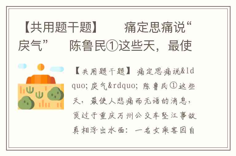 【共用题干题】 痛定思痛说“戾气” 陈鲁民①这些天,最使人悲痛而无语的消息,莫过于重庆万州公交车坠江事故真相浮出水面:一名女乘客因自己不慎错过下车点与司机发生激烈争执,多次用手机殴打司机头部,司机还击之余来不及控制方向盘,致使车辆失控冲断护栏坠入江中,十几条鲜活的生命就这样…… ②其实,像这样的人并不罕见。如果在搜索引擎上输入“坐过站、袭击司机”以及“抢方向盘”等关键词,搜索结果居然达40多起。就在万州公交车坠河惨剧发生仅仅一天后,北京也有一名坐过站的乘客拿着一个装满牛奶的包装箱直接砸向了正在开车的公交车司机,还要抢司机方向盘!幸好司机及时刹车,才避免了更严重的后果。除了公交车,还有在飞机、高铁上闹事的…… ③痛定思痛,为什么会发生这样的惨痛悲剧?除了肇事者的目无法纪,漠视规则,极端自私任性,还有一条就是戾气太重。戾气的主要成分是火气、怒气、怨气、恶气,而这四种气在多数情况下都不会带来好结果。从字形来看,“戾”就是关在房子里的一只狗,因为关太久了,一旦放出来,就会乱咬乱叫。这位女乘客,明明是自己没注意司机报站而错过下车点,却丝毫不顾公共安全,不考虑其他乘客的安危,大吵大闹,大打出手,疯狂挑衅,结果就如同网友形容的那样,“本来只多坐了一站车,却一下子坐到了人生终点站”。面对区区小事,一个戾气十足的人撒泼,胡搅蛮缠,甚至因此闹出人命,全车无辜者陪葬,其戾气惊人至此,是典型的“垃圾人”。 ④毫无疑问,戾气已成了当今社会公敌,“垃圾人”已成危害公共安全的极大隐患。 ⑤戾气的产生,虽有客观原因,譬如受到不公正待遇,受种种不良现象影响,工作环境不好,生活压力太大等,更重要的还是自身素质太差,缺乏教养,缺乏公德意识,缺乏法治观念。因而就会戾气十足,不管不顾,见谁怼谁,不计后果,并把这种恶劣情绪常态化,弥漫在一切空间,浸淫在每一个细胞,迁怒于任何觉得束缚自己的规则。其结果是毁掉自己的心情,破坏了他人的幸福,影响了自己的情绪,毒化了他人的生活,早晚必定酿成更严重的事故。 ⑥平心而论,任何社会、任何时代,不尽如人意处总会存在,我们一方面要积极推动进步力量克服那些消极现象,另一方面也要善于调节心情,提高修养水平和文明素质,不要堕入戾气的陷阱,不当危害社会的“垃圾人”。譬如说,遇事冷静一些,决不跟人瞎起哄,被人当枪使;与人和善一些,宽以待人,严以责己;吃亏时大度一些,看轻身外之物,不必过于计较;争执时谦让一些,少发偏激之语,不干极端之事。如果人人如此,戾气自然就无发生之源,亦无藏身之地,“垃圾人”也会成过街老鼠人人喊打。 ⑦戾气是人精神上的可怕病灶,“垃圾人”是和谐社会的大敌。我们如果不及时遏制戾气的蔓延滋长,不打击形形色色的“垃圾人”,正常的社会秩序就无法得知,人民的生命财产安全就无法得到保障,幸福指数就要大打折扣。拒绝戾气,不做“垃圾人”,既是保护他人,也是爱护自己,更是净化社会,端正风气,真真是善莫大焉! (选自《成都晚报》2018.11.06,有删改) 结合链接材料,谈谈你对《痛定思痛说“戾气”》第③段“面对区区小事,一个戾气十足的人撒泼,胡搅蛮缠,甚至因此闹出人命,全车无辜者陪葬,其戾气惊人至此,是典型的“垃圾人”。”这句子中的“无辜者”的看法。 材料:第二年添教霉菌学,细菌的形状是全用电影来现实的,一段落已完二还没有到下课的时候,便影几片时事的片子,自然都是日本战胜俄国的情形。但偏有中国人夹在里边;给俄国人做侦探,被日本军捕获,要枪毙了,围着看的也是一群中国人;在讲堂里的还有一个我。 “万岁!”他们都拍张欢呼起来。
