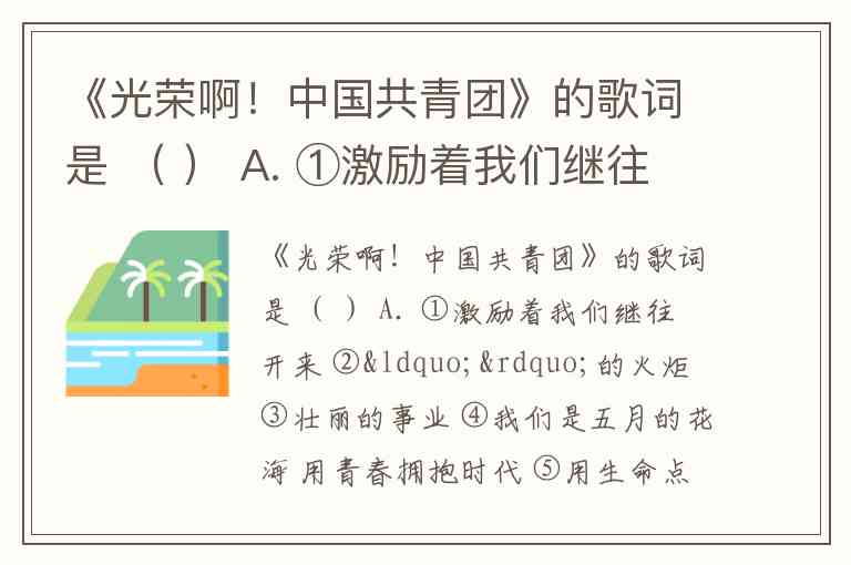 《光荣啊!中国共青团》的歌词是 ( ) A. ①激励着我们继往开来 ②“”的火炬 ③壮丽的事业 ④我们是五月的花海 用青春拥抱时代 ⑤用生命点燃未来 ⑥唤起了民族的觉醒 ⑦我们是初升的太阳 B. A.①③④⑤②⑦⑥ B.④⑦⑤②⑥③① C. ④⑤②③①⑥⑦ D.④⑥⑤③①②⑦
