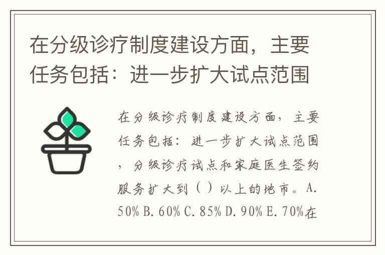 在分级诊疗制度建设方面,主要任务包括:进一步扩大试点范围,分级诊疗试点和家庭医生签约服务扩大到()以上的地市。A.50% B.60% C.85% D.90% E.70%