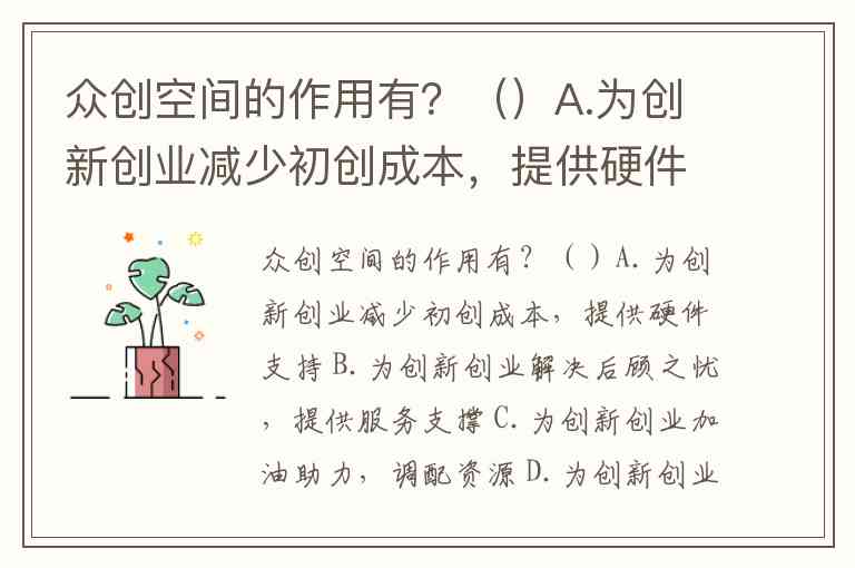 众创空间的作用有?()A.为创新创业减少初创成本,提供硬件支持 B.为创新创业解决后顾之忧,提供服务支撑 C.为创新创业加油助力,调配资源 D.为创新创业引导协同创新营造氛围