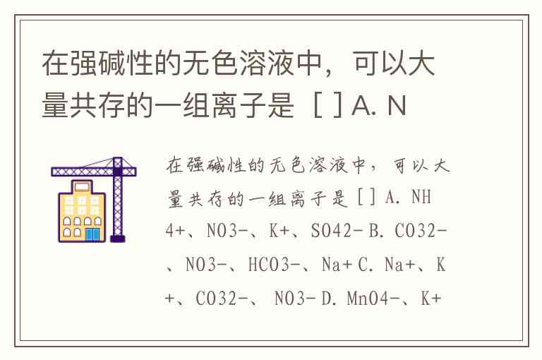 在强碱性的无色溶液中,可以大量共存的一组离子是 [ ] A. NH4+、NO3-、K+、SO42- B. CO32-、NO3-、HCO3-、Na+ C. Na+、K+、CO32-、 NO3- D. MnO4-、K+、Na+、SO42-