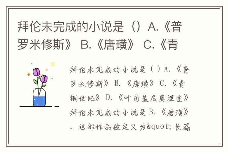 拜伦未完成的小说是()A.《普罗米修斯》 B.《唐璜》 C.《青铜世纪》 D.《叶甫盖尼奥涅金》