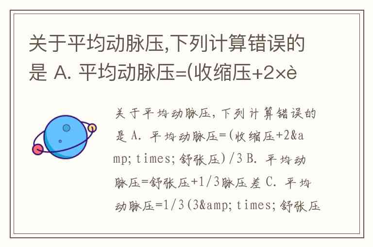 关于平均动脉压,下列计算错误的是 A. 平均动脉压=(收缩压+2×舒张压)/3 B. 平均动脉压=舒张压+1/3脉压差 C. 平均动脉压=1/3(3×舒张压+收缩压-舒张压) D. 平均动脉压=1/3舒张压+2/3收缩压