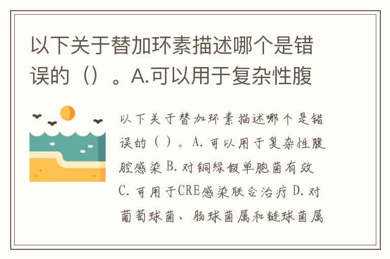 以下关于替加环素描述哪个是错误的()。A.可以用于复杂性腹腔感染 B.对铜绿假单胞菌有效 C.可用于CRE感染联合治疗 D.对葡萄球菌、肠球菌属和链球菌属具有高度抗菌活性 E.以上选项均正确