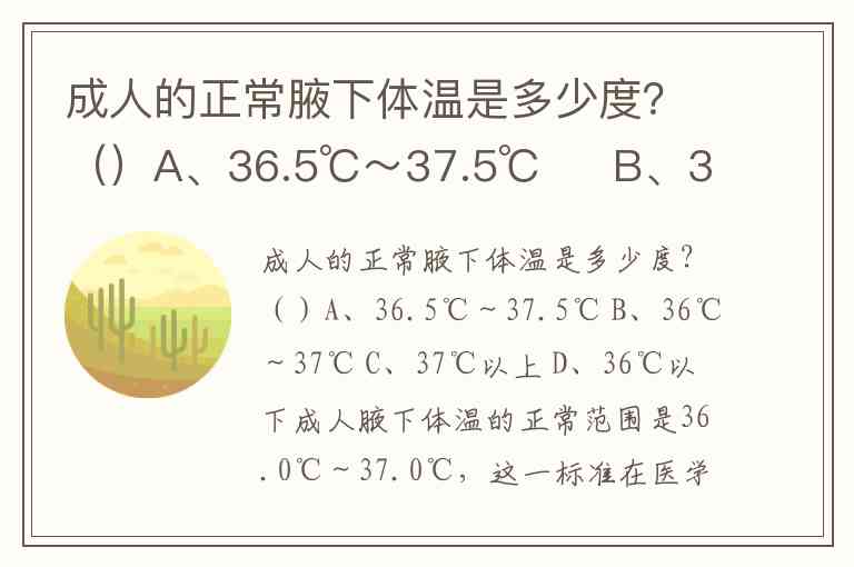成人腋下体温的正常范围是36.0℃~37.0℃,这一标准在医学文献和临床实践中被广泛认可。例如,《第八版诊断学》明确指出腋测法的正常值为36~37℃,而腋温超过37℃即可能提示发热。