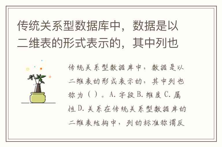 传统关系型数据库中,数据是以二维表的形式表示的,其中列也称为()。A.字段 B.维度 C.属性 D.关系