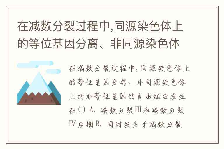在减数分裂过程中,同源染色体上的等位基因分离与非同源染色体上的非等位基因自由组合同时发生于减数第一次分裂后期。此时,纺锤丝牵引同源染色体彼此分离,位于同源染色体上的等位基因随之分开进入不同子细胞;与此同时,非同源染色体随机组合并移向细胞两极,导致其上的非等位基因自由组合,例如控制不同性状的基因(如A/a与B/b)可能形成AB、Ab、aB、ab等组合形式。