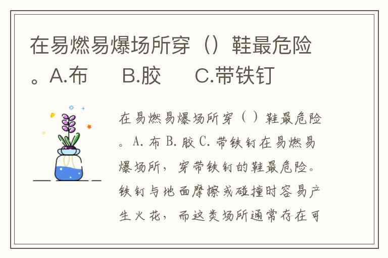在易燃易爆场所穿()鞋最危险。A.布 B.胶 C.带铁钉