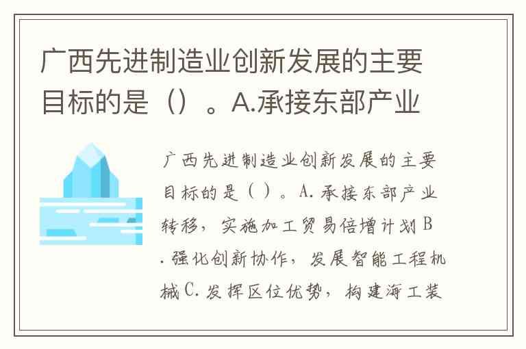 广西先进制造业创新发展的主要目标的是()。A.承接东部产业转移,实施加工贸易倍增计划 B.强化创新协作,发展智能工程机械 C.发挥区位优势,构建海工装备基地 D.促进产业集聚,做大做强新能源汽车