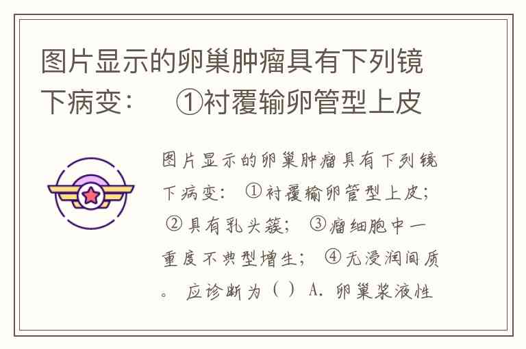 图片显示的卵巢肿瘤具有下列镜下病变: ①衬覆输卵管型上皮; ②具有乳头簇; ③瘤细胞中一重度不典型增生; ④无浸润间质。 应诊断为() A. 卵巢浆液性乳头状囊腺瘤 B. 卵巢浆液性乳头状囊腺癌 C. 卵巢浆液性腺纤维瘤 D. 卵巢交界性浆液性乳头状囊腺瘤 E. 卵巢黏液性乳头状囊腺癌
