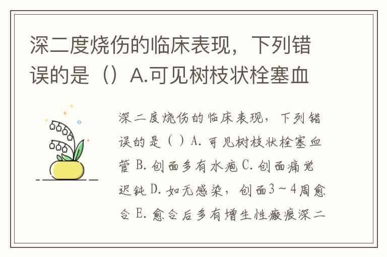深二度烧伤的临床表现中,错误的是 A.可见树枝状栓塞血管。这一特征实际上属于三度烧伤(全层皮肤烧伤)的典型表现,因真皮层完全损毁导致血管凝固坏死,形成肉眼可见的树枝状栓塞。