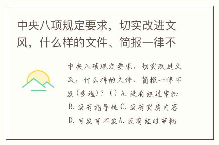 中央八项规定要求,切实改进文风,什么样的文件、简报一律不发(多选)?( ) A.没有经过审批 B.没有指导性 C.没有实质内容 D.可发可不发A.没有经过审批 B.没有指导性 C.没有实质内容 D.可发可不发