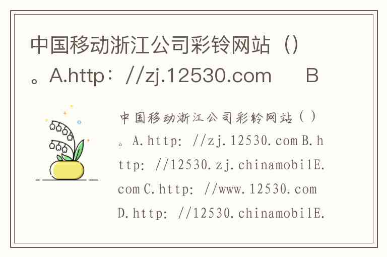中国移动浙江公司彩铃网站()。A.http://zj.12530.com B.http://12530.zj.chinamobilE.com C.http://www.12530.com D.http://12530.chinamobilE.cn