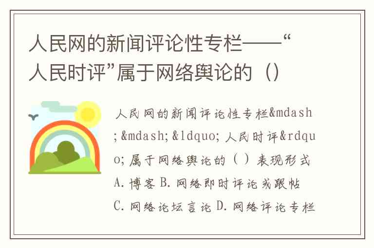 人民网的新闻评论性专栏——“人民时评”属于网络舆论的()表现形式A.博客 B.网络即时评论或跟帖 C.网络论坛言论 D.网络评论专栏