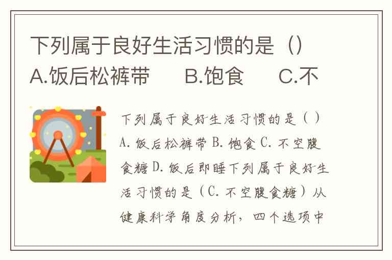 下列属于良好生活习惯的是()A.饭后松裤带 B.饱食 C.不空腹食糖 D.饭后即睡