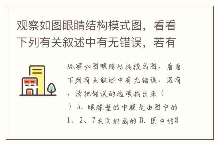 观察如图眼睛结构模式图,看看下列有关叙述中有无错误,若有,请把错误的选项找出来( ) A. 眼球壁的中膜是由图中的1、2、7共同组成的 B. 图中的8上有感光细胞,能感受光线的刺激 C. 当人从明处到暗处时,图中的3会缩小 D. 图中4的曲度是由1中的平滑肌调节的