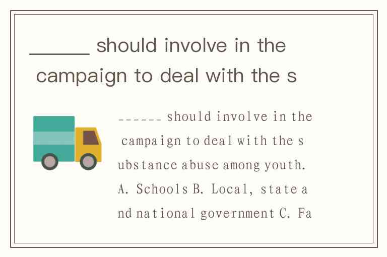 ______ should involve in the campaign to deal with the substance abuse among youth. A. Schools B. Local, state and national government C. Family and community D. All of the above