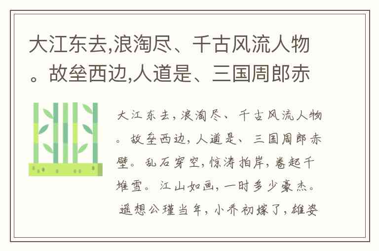 A “大江东去”中的“大江”即长江,符合宋代诗词中对长江的普遍称谓。