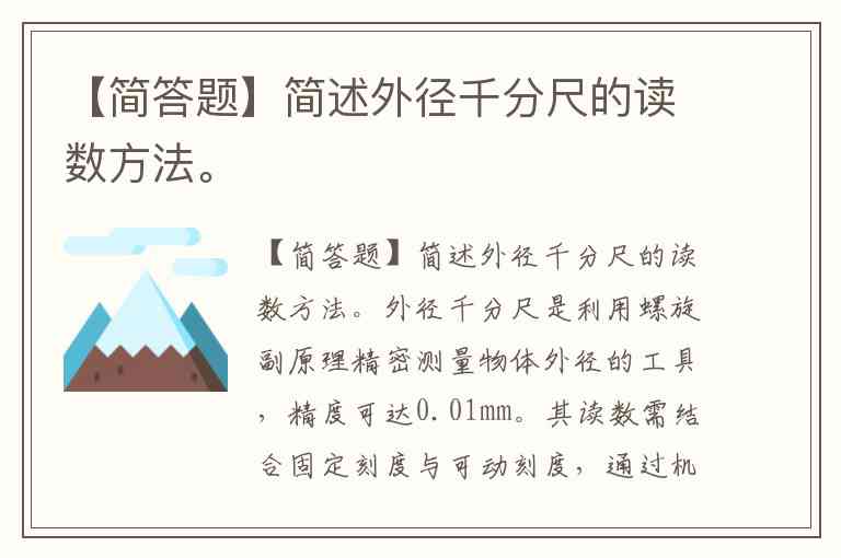 外径千分尺是利用螺旋副原理精密测量物体外径的工具,精度可达0.01mm。其读数需结合固定刻度与可动刻度,通过机械放大实现高精度测量。