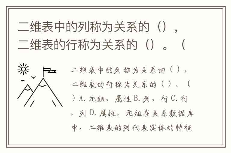 二维表中的列称为关系的(),二维表的行称为关系的()。()A.元组,属性 B.列,行 C.行,列 D.属性,元组