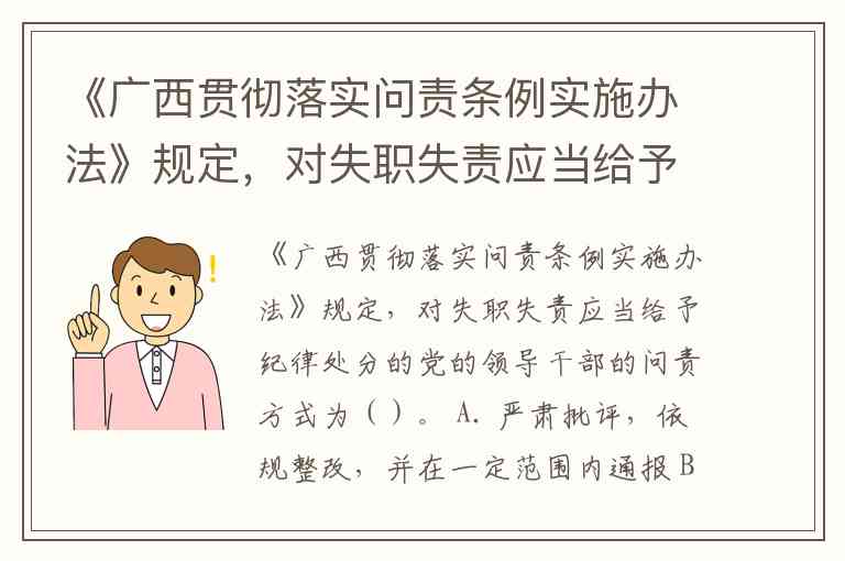 《广西贯彻落实问责条例实施办法》明确规定,对失职失责应当给予纪律处分的党的领导干部,其问责方式为依照《中国共产党纪律处分条例》追究纪律责任。这一规定对应问责体系中的第四种方式,适用于失职失责行为已达到需要纪律惩戒的严重程度。