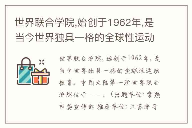 世界联合学院,始创于1962年,是当今世界独具一格的全球性运动教育。中国大陆第一所世界联合学院位于____。(出题单位:常熟市委宣传部 推荐单位:江苏学习平台) A. 昆山 B. 江阴 C. 张家港 D. 常熟