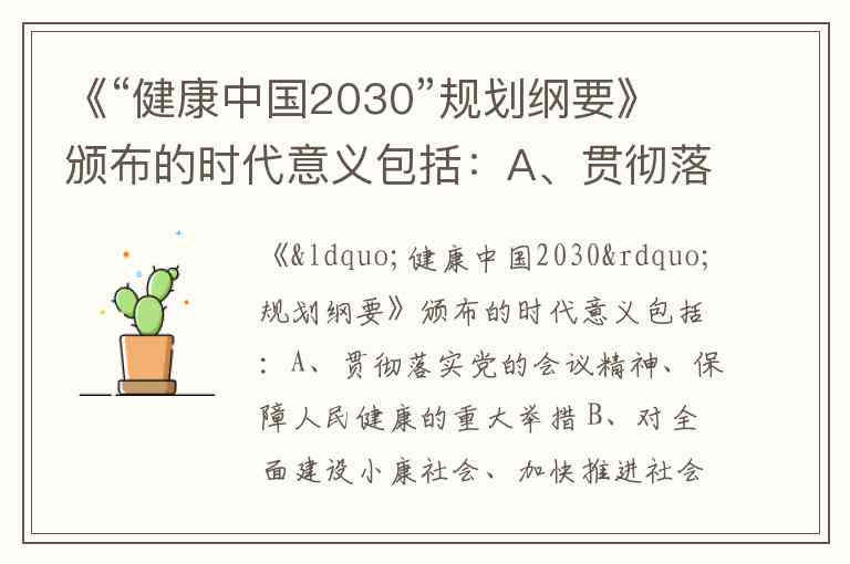 《“健康中国2030”规划纲要》颁布的时代意义包括:A、贯彻落实党的会议精神、保障人民健康的重大举措 B、对全面建设小康社会、加快推进社会主义现代化具有重大意义 C、是我国积极参与全球健康治理、履行我国对联合国“2030可持续发展议程”承诺的重要举措 D、是执政党对人民作出的一个郑重承诺