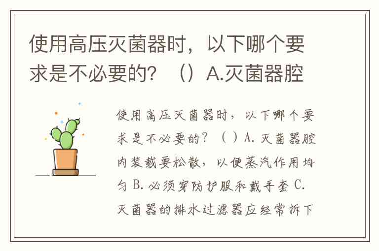 使用高压灭菌器时,以下哪个要求是不必要的?()A.灭菌器腔内装载要松散,以便蒸汽作用均匀 B.必须穿防护服和戴手套 C.灭菌器的排水过滤器应经常拆下清洗 D.待温度降至80℃以下时才能打开高压灭菌器