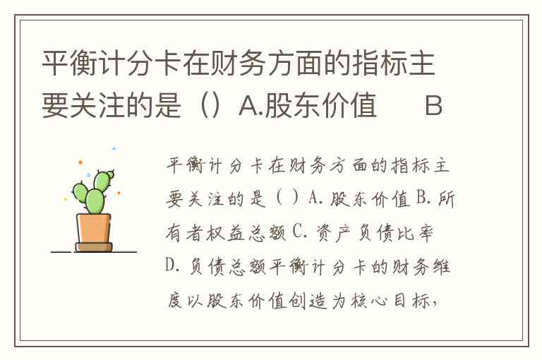 平衡计分卡在财务方面的指标主要关注的是()A.股东价值 B.所有者权益总额 C.资产负债比率 D.负债总额