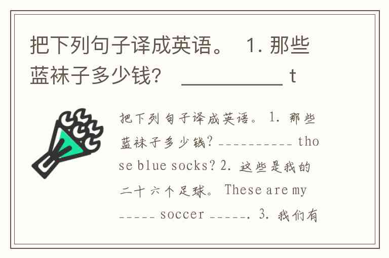 把下列句子译成英语。 1. 那些蓝袜子多少钱? __________ those blue socks? 2. 这些是我的二十六个足球。 These are my _____ soccer _____. 3. 我们有各色毛衣,每件50元。 We have sweaters _____ at ¥50. 4. 这些红裤子30美元。 These _____ are $30. 5. 到华星来吧,亲自看看。 Come _____ Huaxing and see for _____.