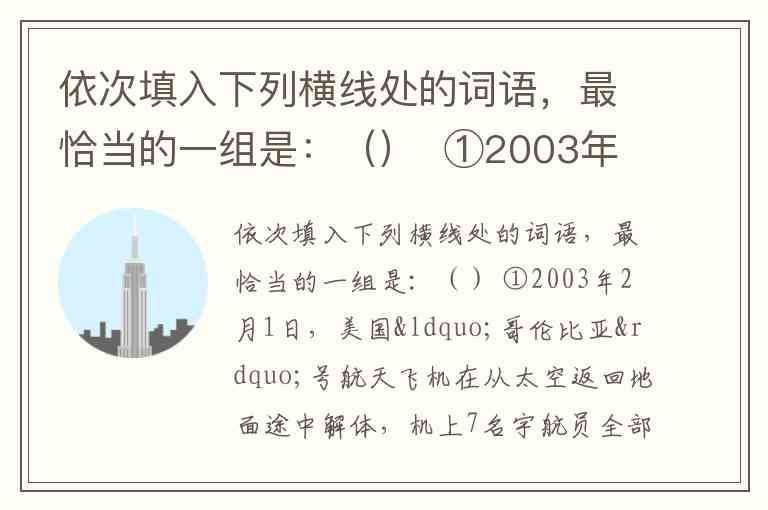 依次填入下列横线处的词语,最恰当的一组是:() ①2003年2月1日,美国“哥伦比亚”号航天飞机在从太空返回地面途中解体,机上7名宇航员全部______。消息传出,世界震惊。 ②地球生态系统是经过自然界的长期______形成的,它是人类生活的惟一基础,失去这一基础,人类只能彻底毁灭。 ③现在提倡的“研究性学习”模式,就是让我们置于问题情景中去体验,去动手、动脑,感受_______方案的设计、现象的观察、数据的处理和结果的分析。A.遇害 变化 实验 B.遇难 演化 实验 C.遇难 演化 试验 D.遇害 变化 试验