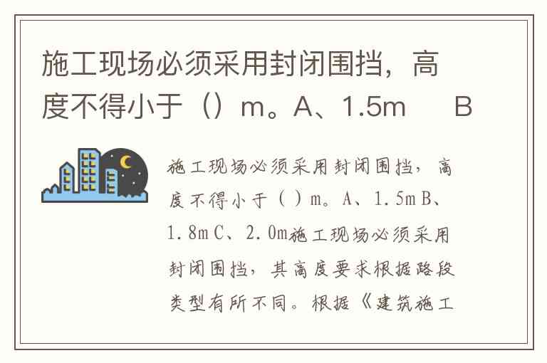施工现场必须采用封闭围挡,高度不得小于()m。A、1.5m B、1.8m C、2.0m