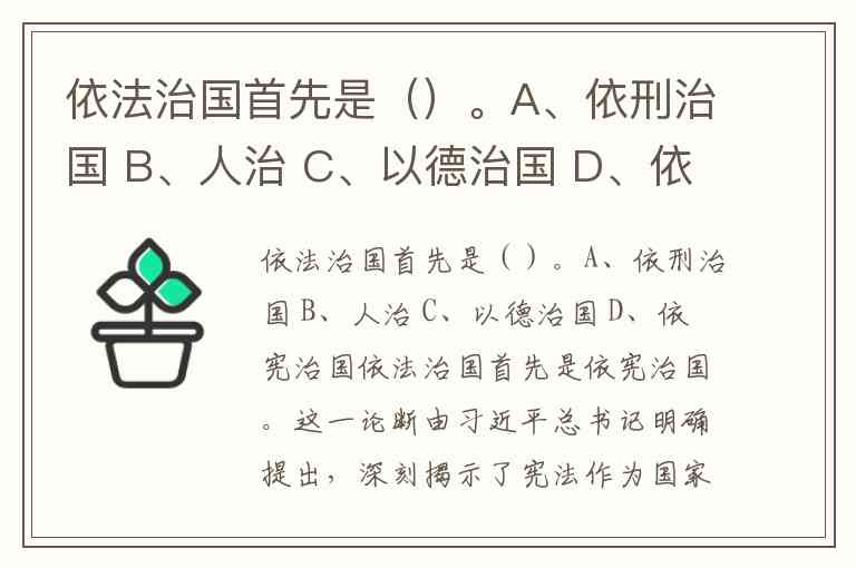 依法治国首先是()。A、依刑治国 B、人治 C、以德治国 D、依宪治国