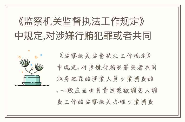 《监察机关监督执法工作规定》中规定,对涉嫌行贿犯罪或者共同职务犯罪的涉案人员立案调查的,一般应当由负责该案被调查人调查工作的监察机关办理立案调查手续。()