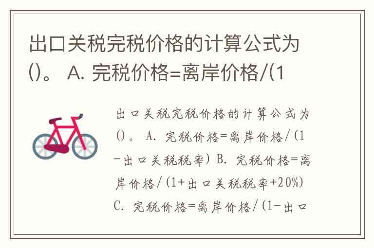 出口关税完税价格的计算公式为()。 A. 完税价格=离岸价格/(1-出口关税税率) B. 完税价格=离岸价格/(1+出口关税税率+20%) C. 完税价格=离岸价格/(1-出口关税税率+20%) D. 完税价格=离岸价格/(1+出口关税税率)