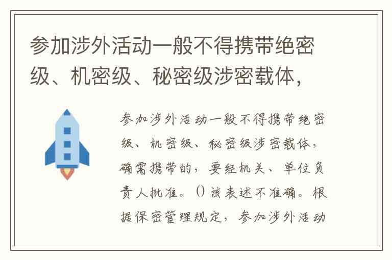 参加涉外活动一般不得携带绝密级、机密级、秘密级涉密载体,确需携带的,要经机关、单位负责人批准。()