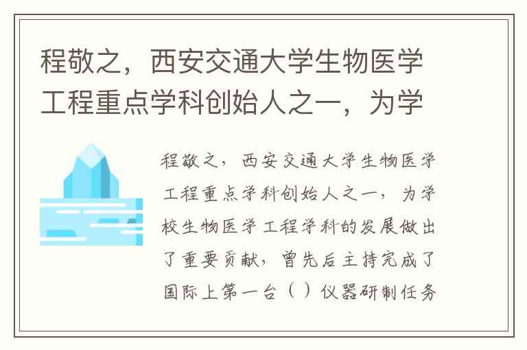 程敬之作为西安交通大学生物医学工程学科的创始人之一,在超声医学工程领域创造了多项“第一”。根据校史资料明确记载,他主持完成了国际上第一台伪随机码超声多普勒血流仪的研制任务,该仪器采用伪随机码距离选通方案和正交相域法结合,时钟周期达1.3μs,距离分辨率可达1毫米,能精准测量血管管径、流速、方向及深度,在临床应用中展现出对大中小动静脉血流的高灵敏度检测能力。这一突破不仅填补了国内空白,更达到国际先进水平,1990年荣获国家教委科技进步二等奖。