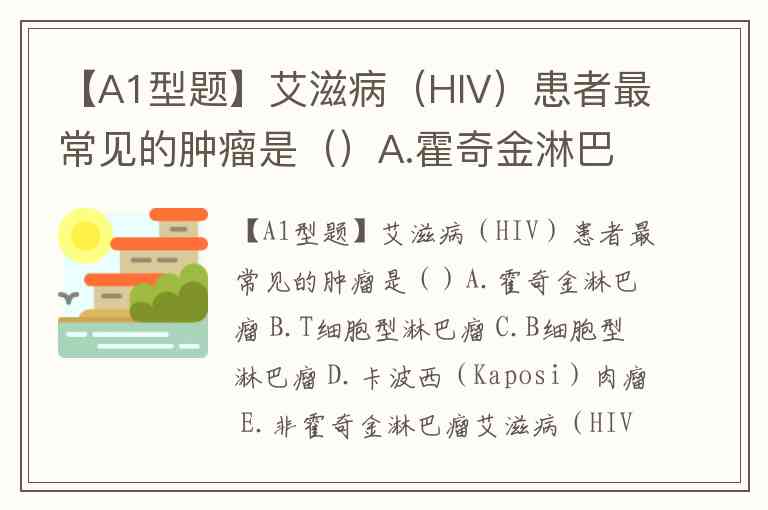 【A1型题】艾滋病(HIV)患者最常见的肿瘤是()A.霍奇金淋巴瘤 B.T细胞型淋巴瘤 C.B细胞型淋巴瘤 D.卡波西(Kaposi)肉瘤 E.非霍奇金淋巴瘤