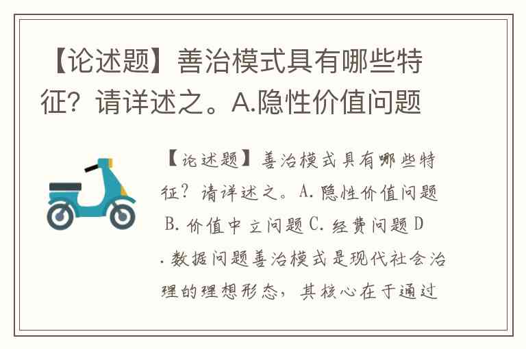 【论述题】善治模式具有哪些特征?请详述之。A.隐性价值问题 B.价值中立问题 C.经费问题 D.数据问题