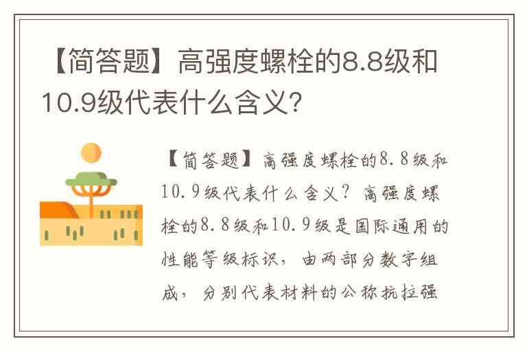【简答题】高强度螺栓的8.8级和10.9级代表什么含义?