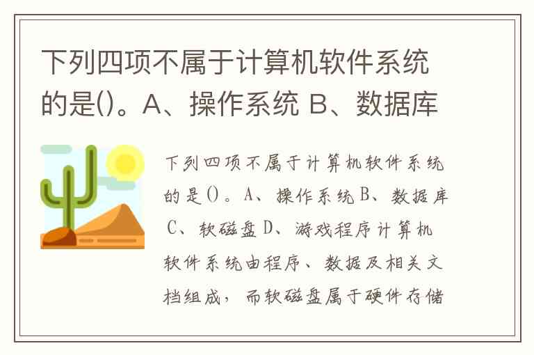 下列四项不属于计算机软件系统的是()。A、操作系统 B、数据库 C、软磁盘 D、游戏程序