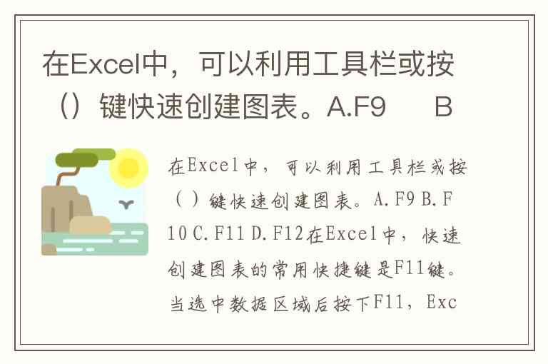 在Excel中,可以利用工具栏或按()键快速创建图表。A.F9 B.F10 C.F11 D.F12