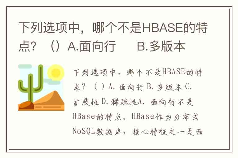 下列选项中,哪个不是HBASE的特点?()A.面向行 B.多版本 C.扩展性 D.稀疏性
