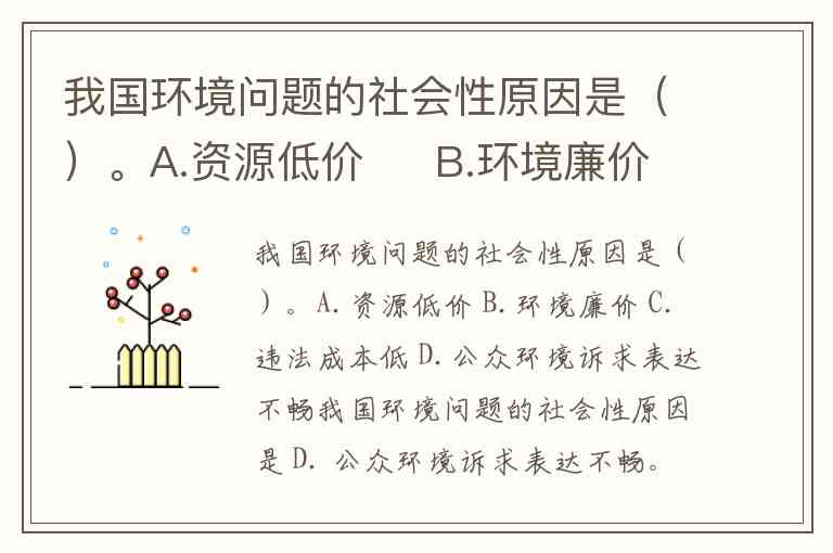 我国环境问题的社会性原因是()。A.资源低价 B.环境廉价 C.违法成本低 D.公众环境诉求表达不畅